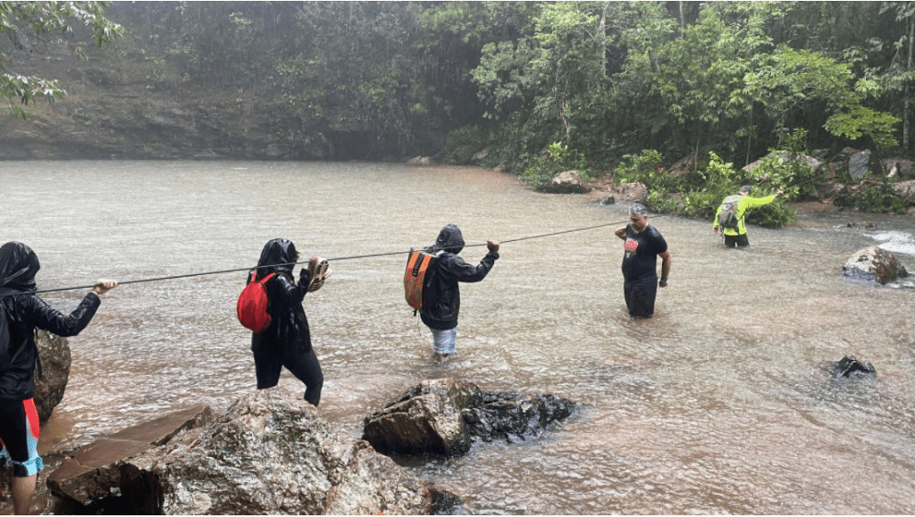 At that point, things drastically changed. There must have been a torrential downpour upstream, but by the time we once again had to cross the river, things looked starkly different as the water was brown, significantly higher, and considerably faster.